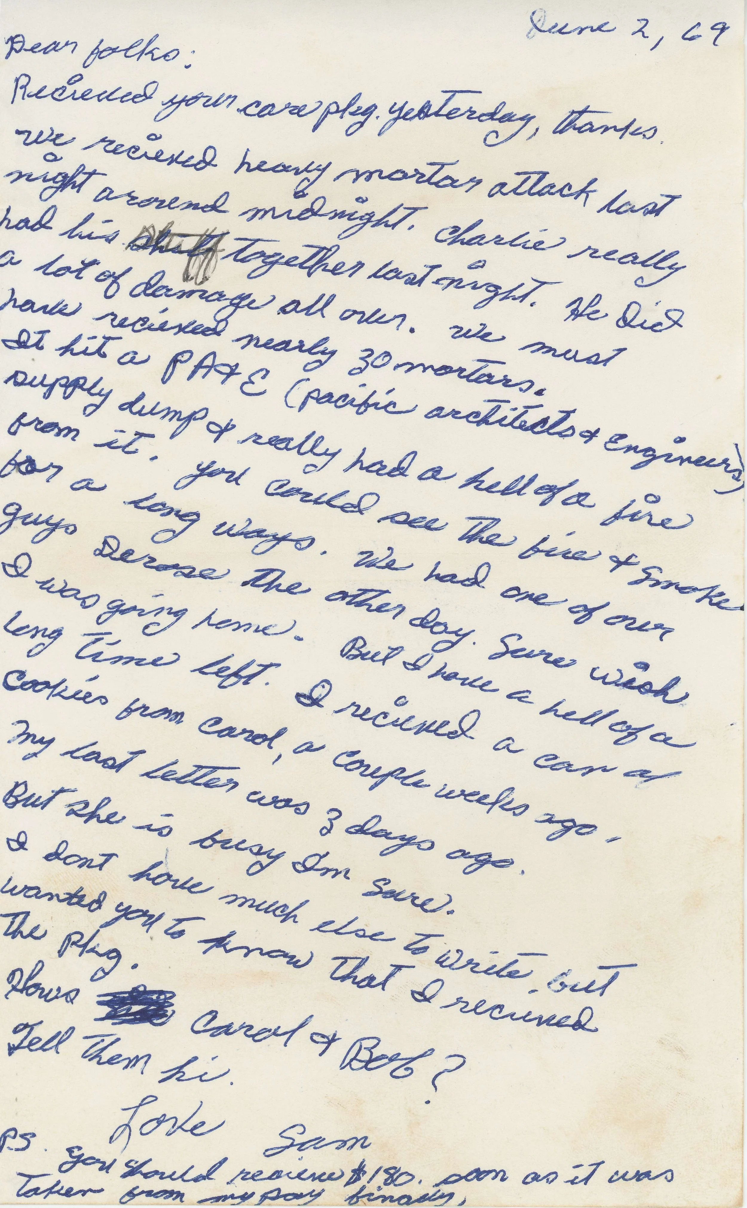 Received your care pkg. yesterday, thanks. We received heavy mortar attack last night around midnight. Charlie really had his stuff together last night. He did a lot of damage all over. We must have received nearly 30 mortars. It hit a PA+E (pacific architects + engineers) supply dump + really had a hell of a fire from it. You could see the fire and smoke for a long ways. We had one of our guys [illegible] the other day. Sure wish I was going home. But I have a hell of a long time left. I received a can of cookies from Carol a couple weeks ago. My last letter was 3 days ago. But she is busy I’m sure. I don’t have much else to to write, but wanted you to know that I received the pkg. How’s Carol + Bob? Tell them hi.