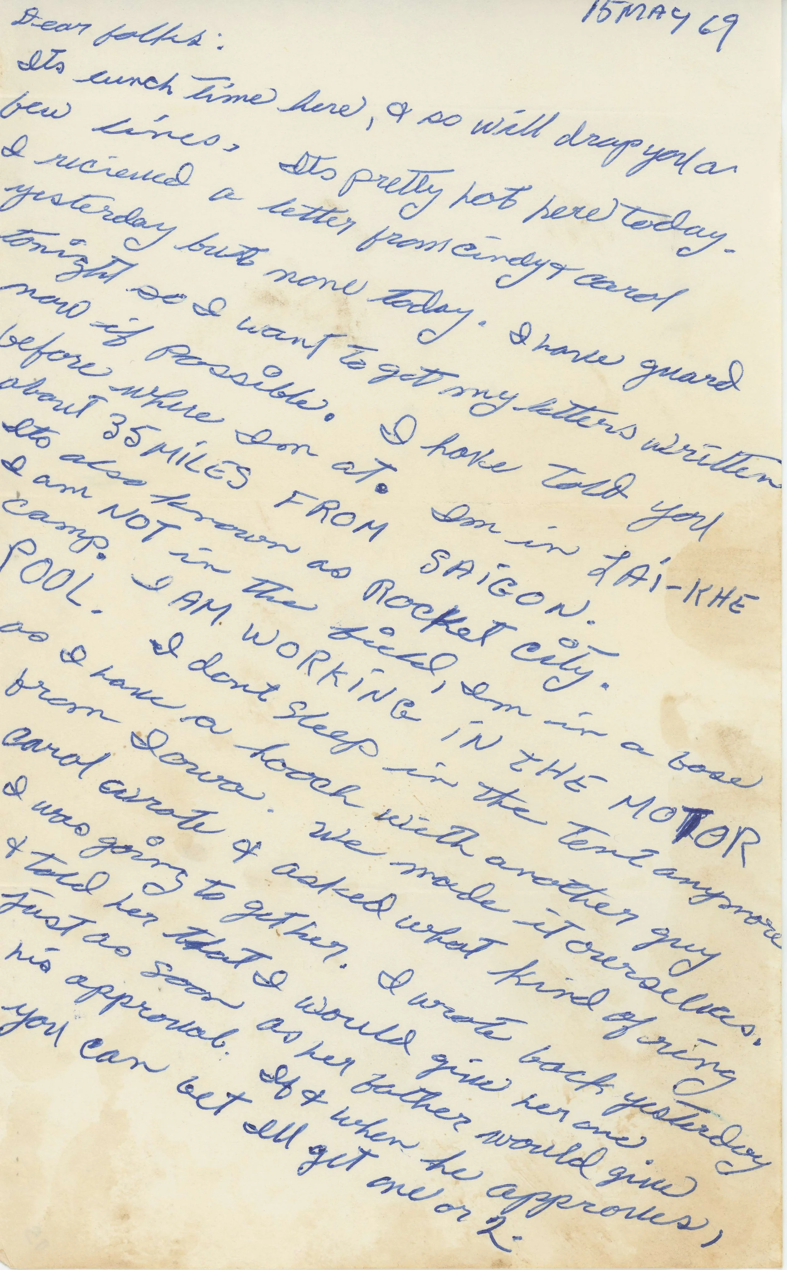 It’s lunch time here, so will drop you a few lines. It’s pretty hot here today. I received a letter from Cindy + Carol yesterday but none today. I have guard tonight so I want to get my letters written now if possible. I have told you before where I am at. I’m in LAI-KHE about 35 MILES FROM SAIGON. It’s also known as Rocket City. I am NOT in the field, I’m in a base camp. I AM WORKING IN THE MOTOR POOL. I don’t sleep in the tent anymore as I have a hooch with another guy from Iowa. We made it ourselves. Carol wrote + asked what kind of ring I was going to get her. I wrote back yesterday + told her that I would give her one just as soon as her father would give his approval. If + when he approves you can bet I’ll get one or 2.