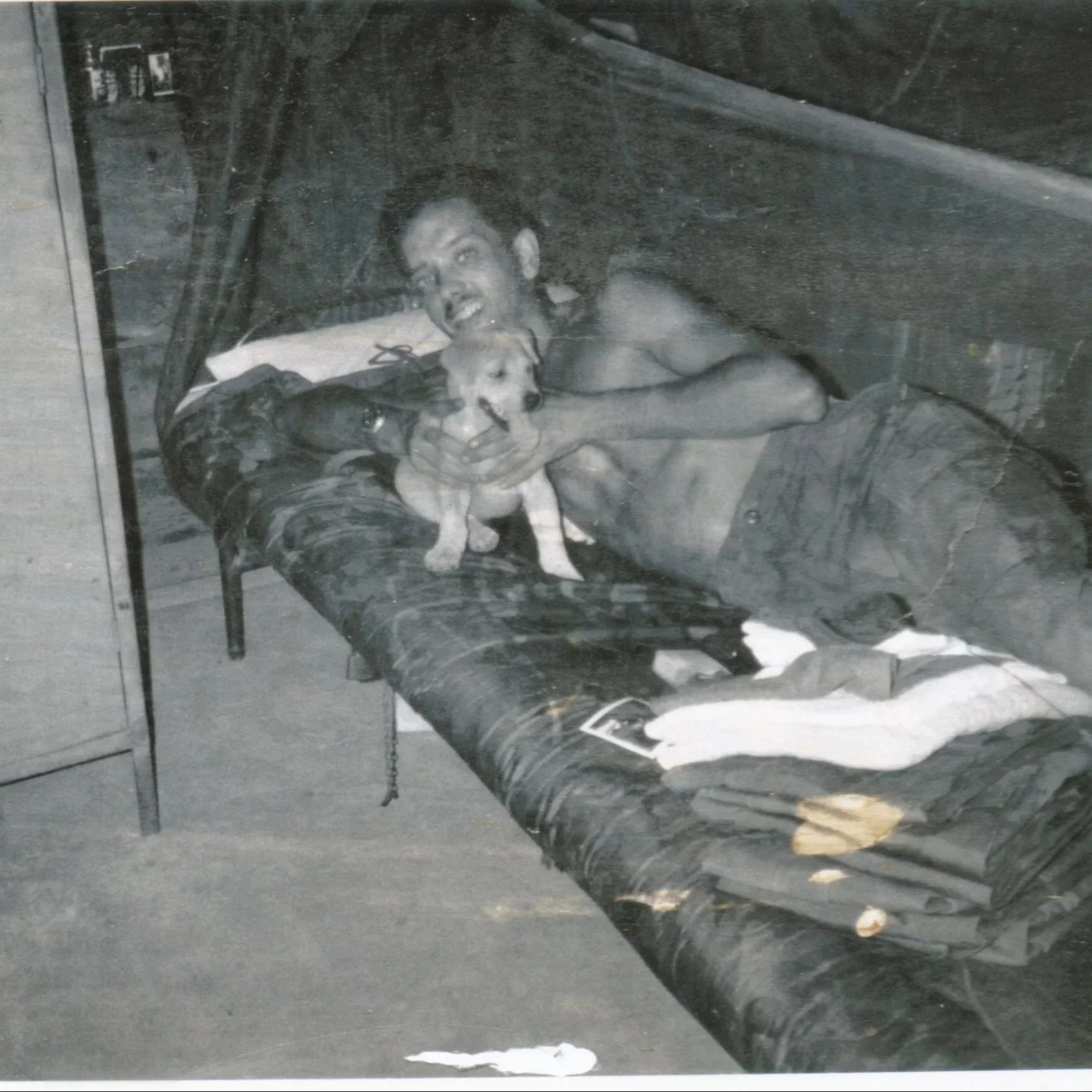Sam made the most of every situation, including befriending a stray dog in Lai Khevn, Vietnam in 1969. Notice the mosquito netting he rolled up around his bunk, which is inside a large tent. (Object ID P2069.6.30)