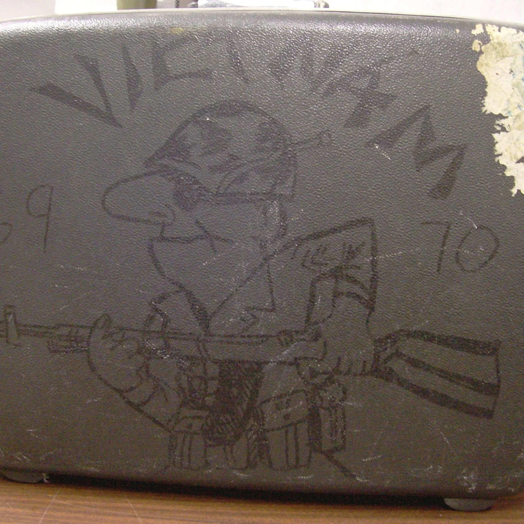 After his tour in Vietnam, Sam sat at a train station in Weisbotton, Germany for RR (rest and relaxation) when a fellow soldier drew “trench art” pictures using a magic marker on both sides of his suitcase. (Object ID 2007.1390.002)