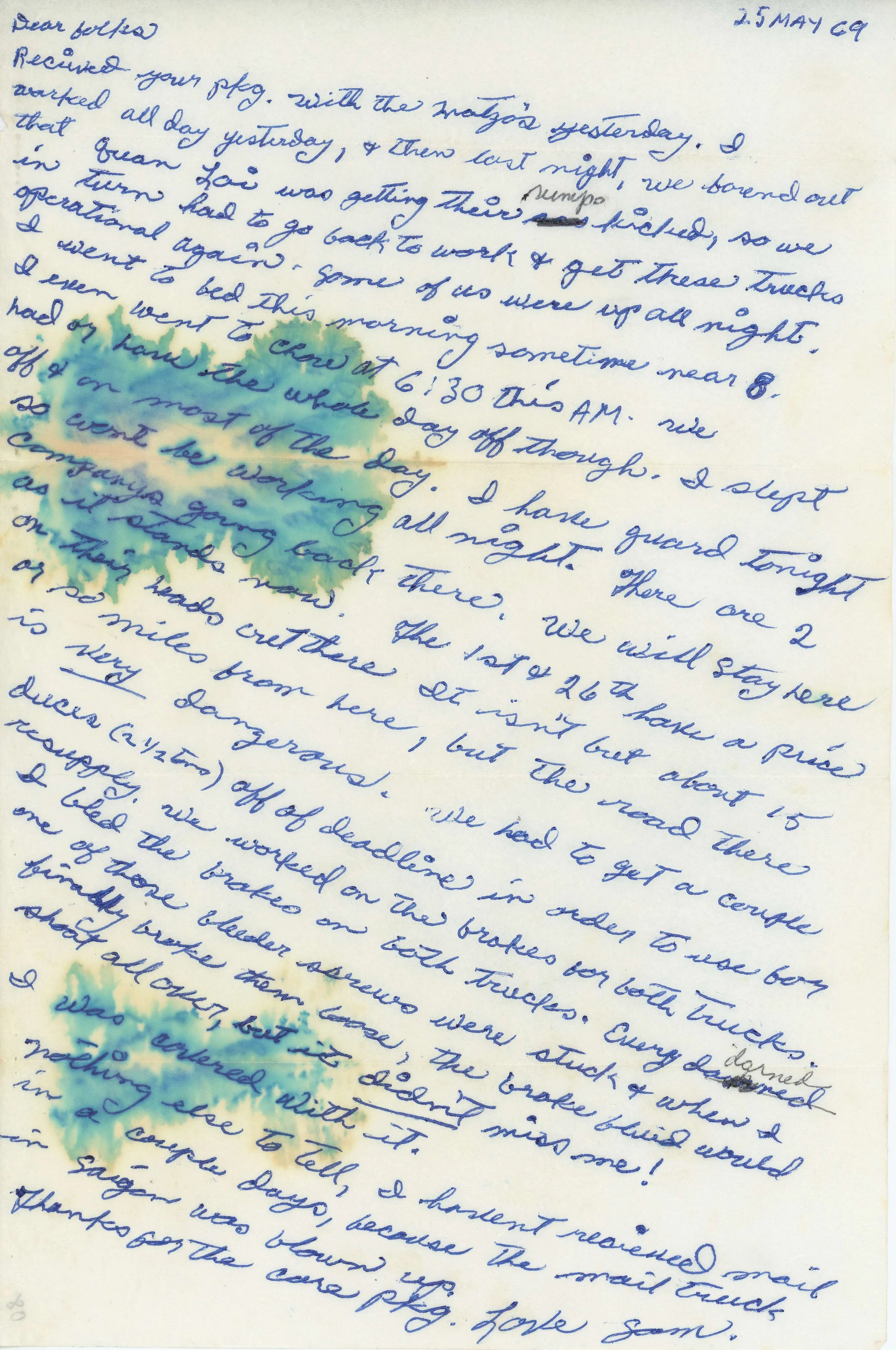 Received your pkg. with the [illegible] yesterday. I worked all day yesterday, + then last night, we found out that Quan Loi was getting their rumps kicked, so we in turn had to go back to work + get these trucks operational again. Some of us were up all night. I went to bed this morning sometime near 8. I even went to chow at 6:30 this AM. We had or have the whole day off though. I slept off and on most of the day. I have guard tonight so won’t be working all night. There are 2 companies going back there. We will stay here as it stands now. The 1st + 26th have a price on their heads out there. It isn’t but about 15 or so miles from here, but the road there is very dangerous. We had to get a couple deuces off of deadline in order to use for resupply. We worked on the brakes for both trucks. I bled the brakes on both trucks. Every darned one of the bleeder screws were stuck + when I finally broke them loose, the brake fluid would shoot all over, but it didn’t miss me! I was covered with it. Nothing else to tell, I haven’t received mail in a couple days, because the mail trucks in Saigon were blown up. Thanks for the care pkg.