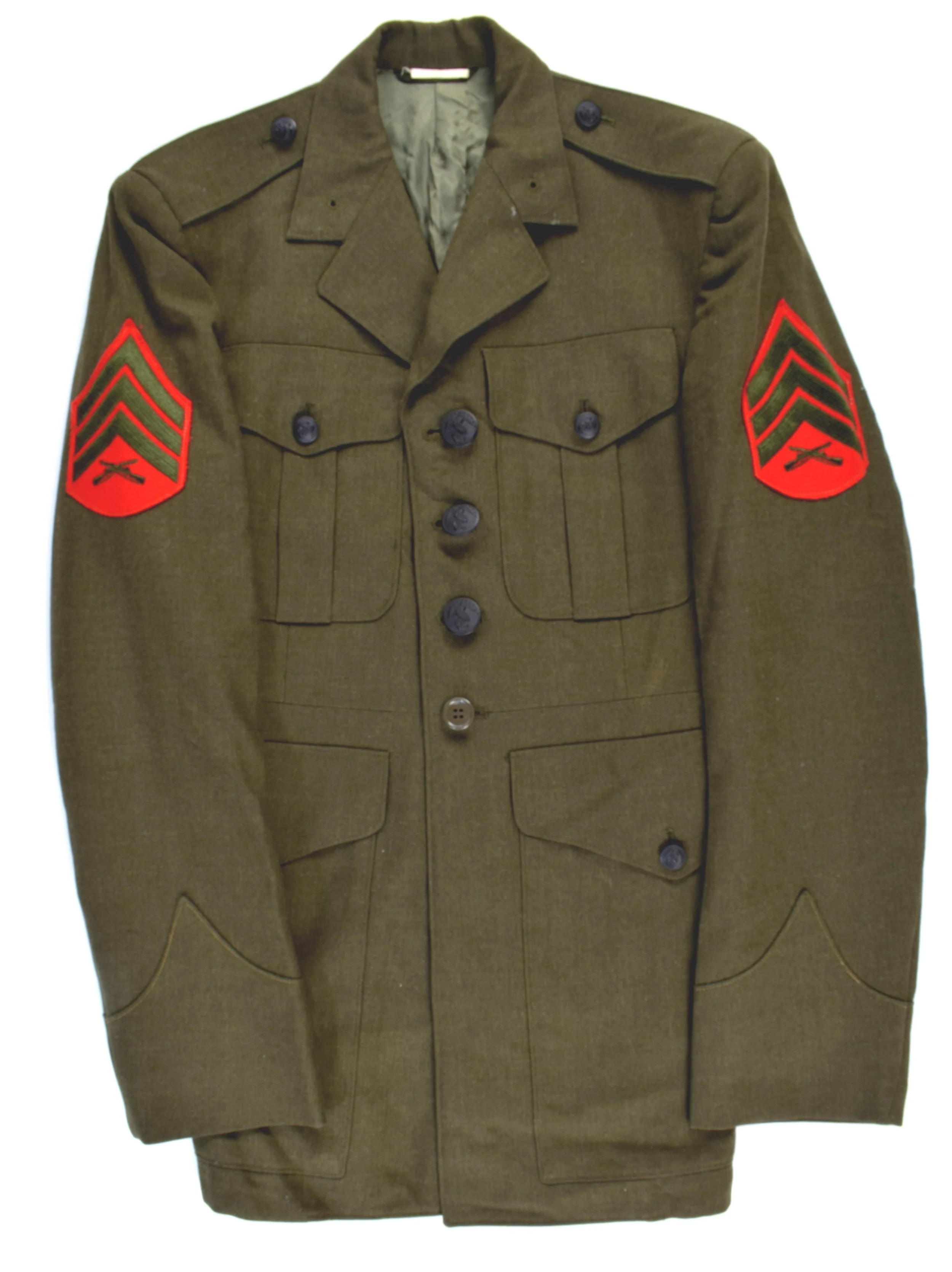 Vietnam War-era US Marine Corps Service A uniform jacket belonging to Bruce Sommer. The jacket is dark green with red and green rank chevrons on each shoulder. Rank chevrons are those of a Sergeant (E-5). All but one of the buttons is black with the Marine Corps insignia. (Object ID 2025.2101.001)