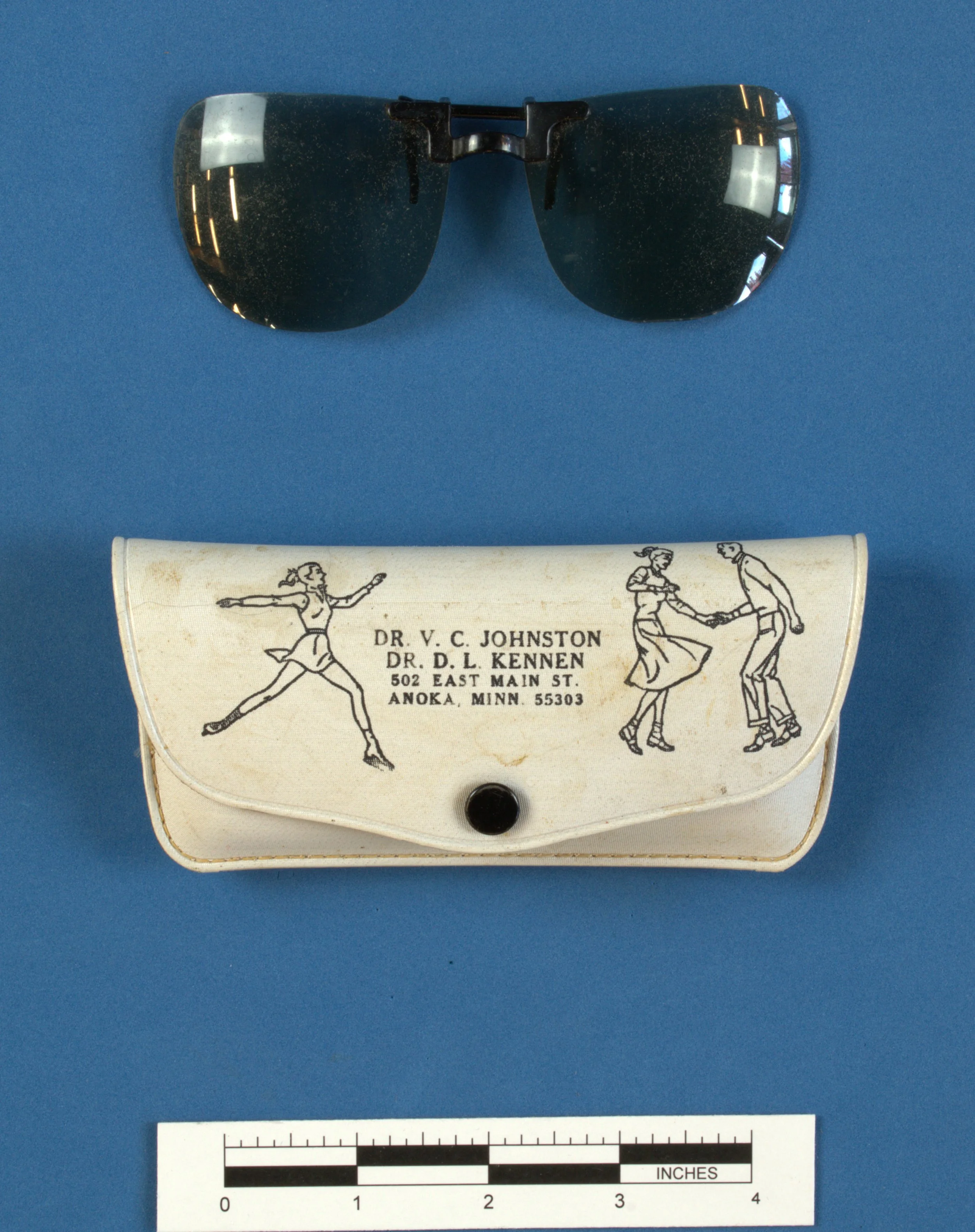 Eye glasses and case from the practice of Dr. Victor C. Johnston and Dr. D.L. Kennen, located at 502 East Main Street, Anoka. This belonged to Alton (Chuck) Drury. Dr. Johnston was on Drury's trap shooting team, and always offered to get him new glasses when Drury missed his shots too often. (Object ID 2019.0030.009)