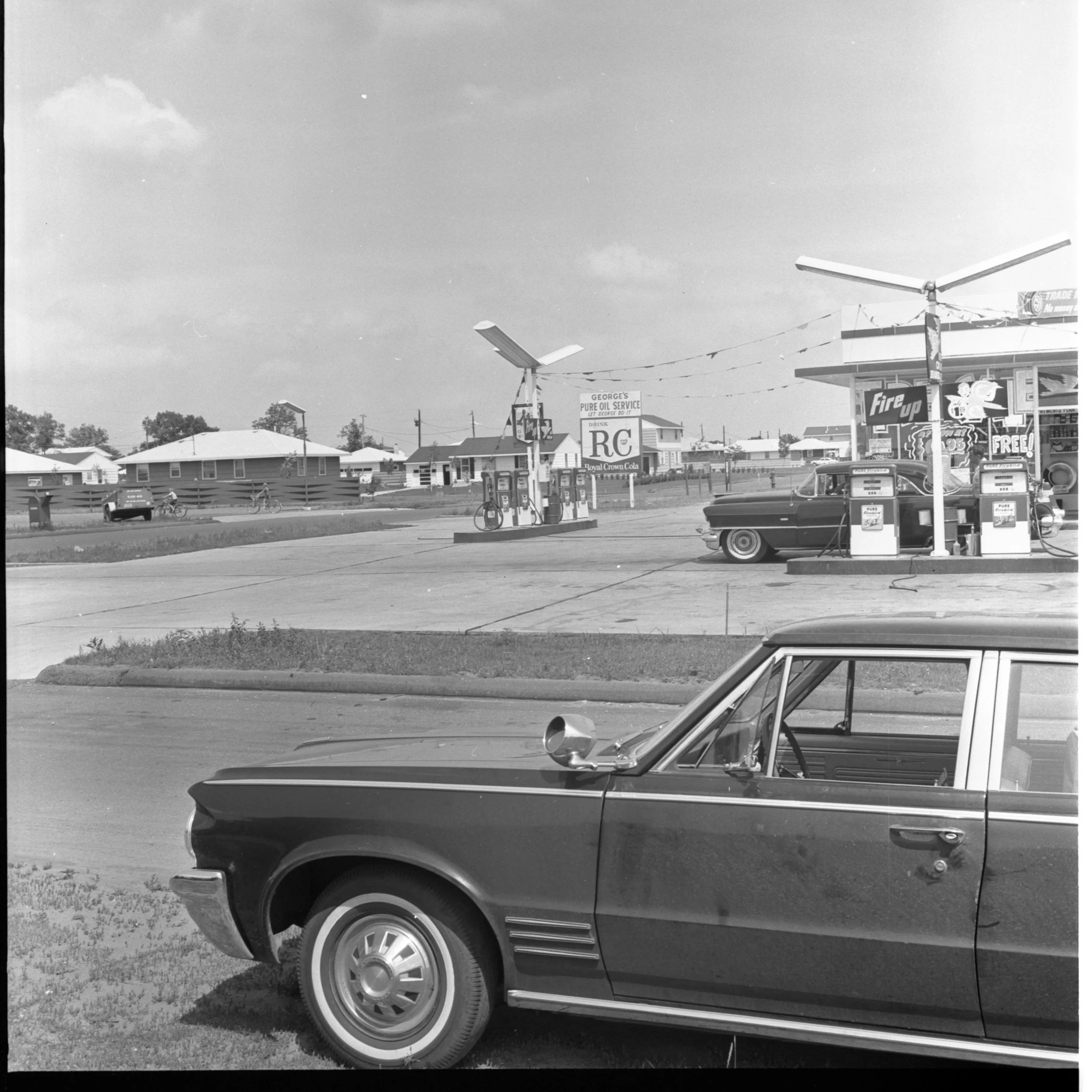 06/18/1964, sign accident at 111th and University. Pure Oil. Several photos of George's Pure Oil Service station ("Let George Do it"). Signs for Royal Crown Cola and S&H Green Stamps. Near a residential neighborhood, and several houses are shown. Used tires stacked near building. Parts of hand-painted sign are lying near building and near fence. Injured person is bein put on a stretcher. Bicycle is lying on the grass near a part of the sign. Coon Rapids police car.