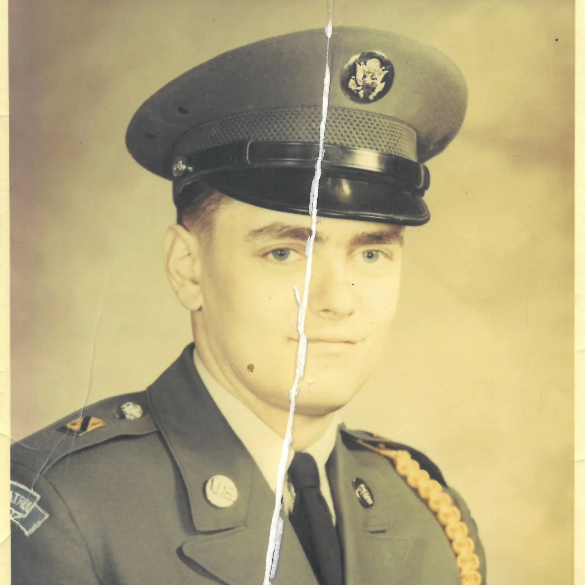 Color photograph of Leslie Cowden, likely within a year out of basic training. It is suspected that he is 19 or 20 in this picture (Object ID 2018.1810.028) How did his face and expression change between the two images? Why? If you didn’t know, how could you guess which photo was taken first?