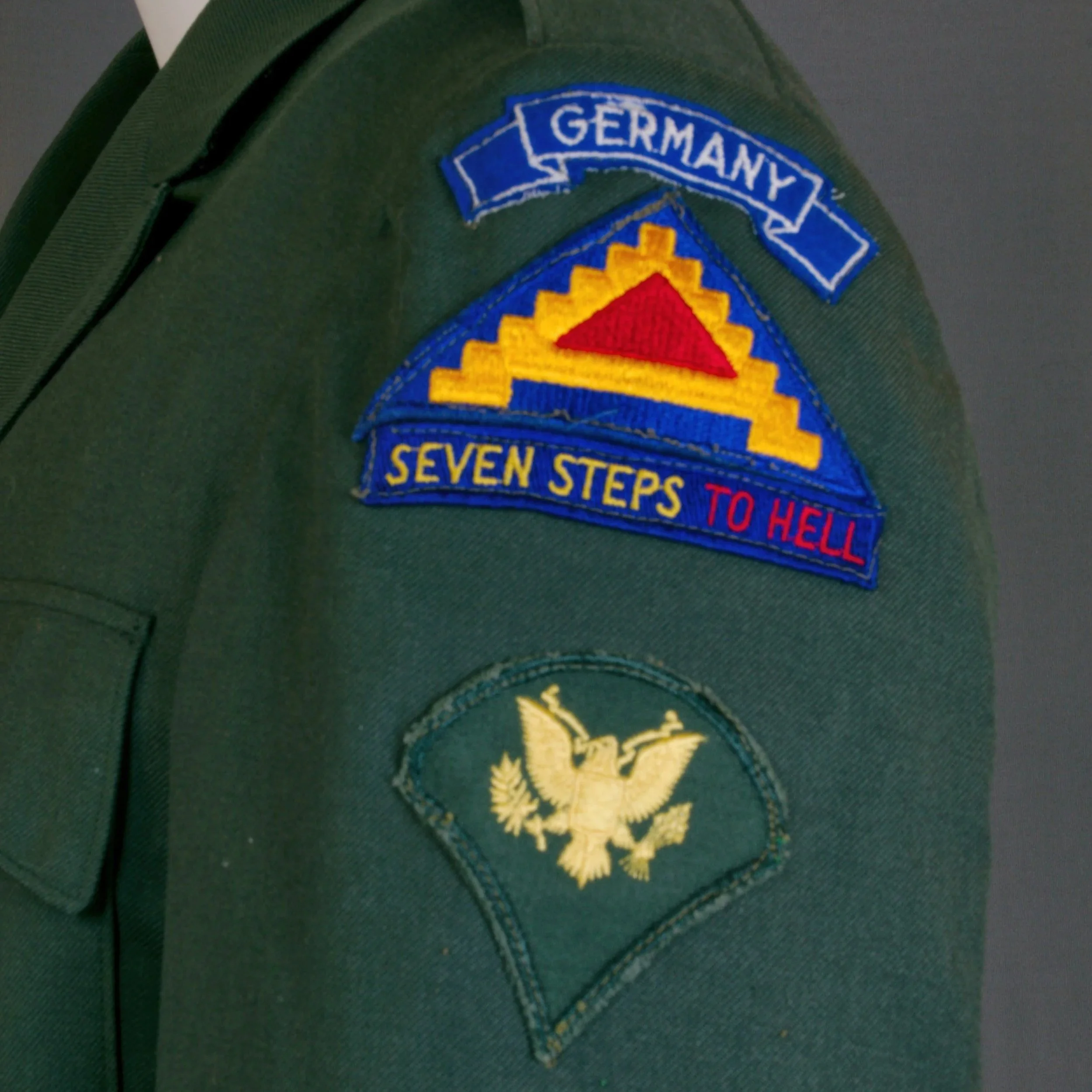 The jacket is green cloth with silver buttons. On the left sleeve just below the shoulder is a blue patch that reads "Germany" (Cowden was originally stationed in Germany before volunteering to go to Vietnam). Below that is the red, yellow, and blue pyramid insignia patch of the Seventh United States Army (which was stationed in Europe during the 1960s); below the pyramid is the unofficial motto "Seven Steps To Hell." On the right sleeve just below the shoulder is a blue patch that reads "Border Patrol". On both sleeves are Army specialist patches, green with a rounded top and diamond point at the bottom with a yellow eagle embroidered on them. Other decorations are visible on this jacket in Cowden's Army portrait (see item 2018.1810.019).
