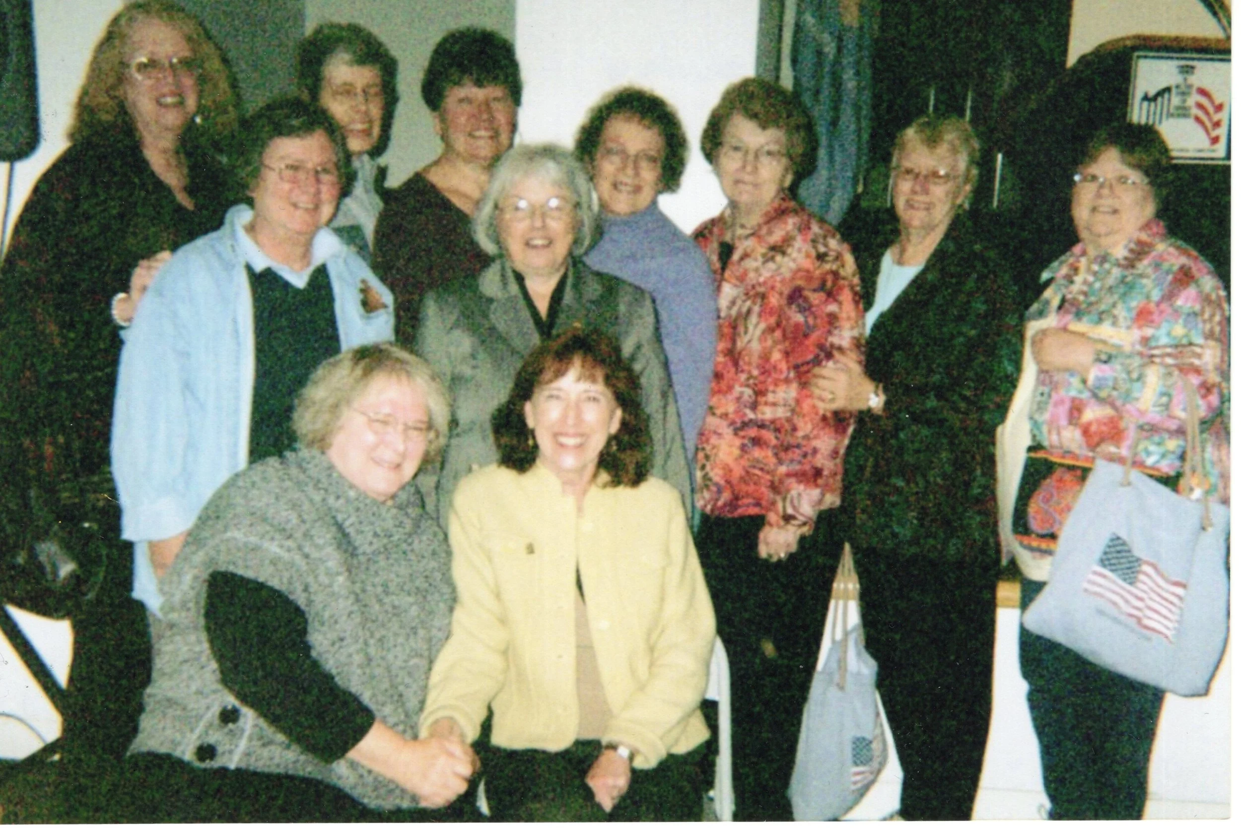 Eleven women stand together indoors. The description on the back reads: "Mary Beth Crowley, Phyllis Schmid, Lynn Kohl, Donna Korf, Valerie Buchan, MaryLu Brunner, Lynn Bower, Unknown, Unknown, Mary Breed, Diane Evans." (Object ID 2025.2114.004a)