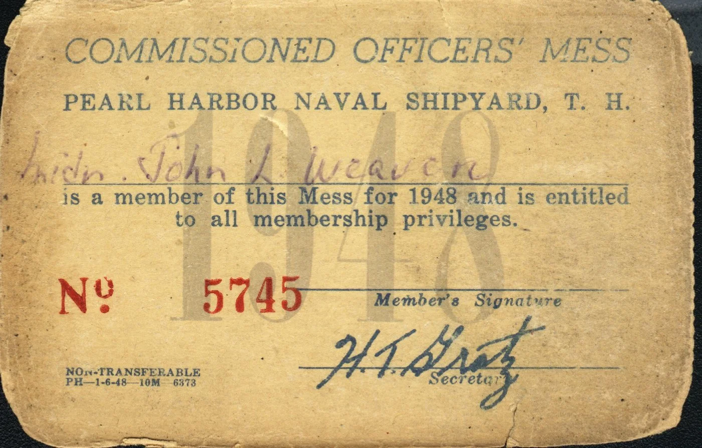 Commissioned Officers Mess pass. Pearl Harbor Naval Shipyard. Belonged to John L. Weaver when stationed at Pearl Harbor. 1948. No. 5745. According to John's son Jeff the passes had been kept in John's wallet up until the day he passed away. (Object ID 2724.A)